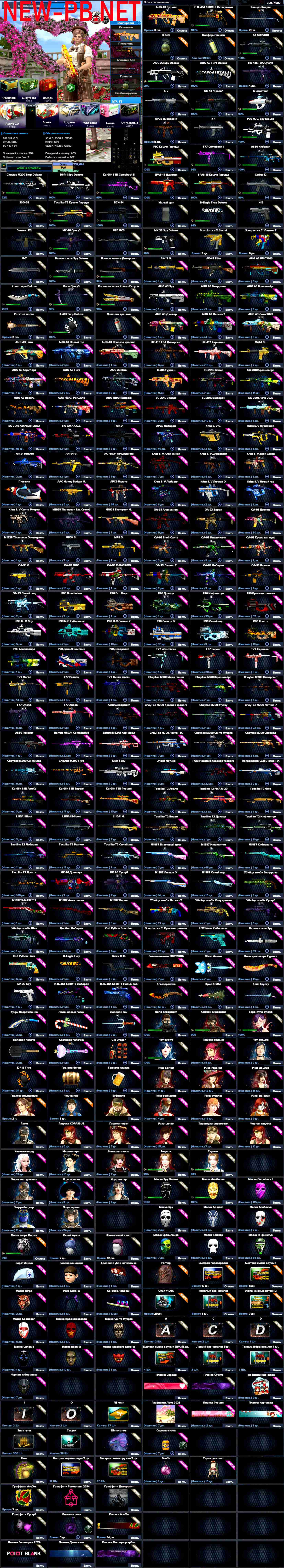 Голд Еж (С Лычкой за ПО) + Тигр + SPY + Kar98k TSR, T77 Comeback II + Снегострел + AS50 Киберия + Tactilite, P90, SPAS, Костяные ножи Крыло Гаруды + SPAS Дух огня + MK, Коса Суккуб + RB Октаграмма + Мачете Диверсант + Маска Альбиона + Волк, Кайман-Диверсант + Чоу, Тарантула-Суккуб + Знак пули 350шт + PB коин 37шт + 732к GP + Who Cares 3/8 + Биоугроза 2/5 + Киберпанк 5/8 + Ар-деко 4/7 + Отчуждение 4/5 + Zvezda 2/6 + AoeXe2.0 2/6 + AoeXe 3/9 + Аниме 2/5